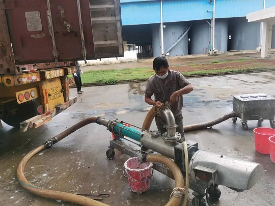 金福橡膠加工分公司員工正在裝運濃乳。